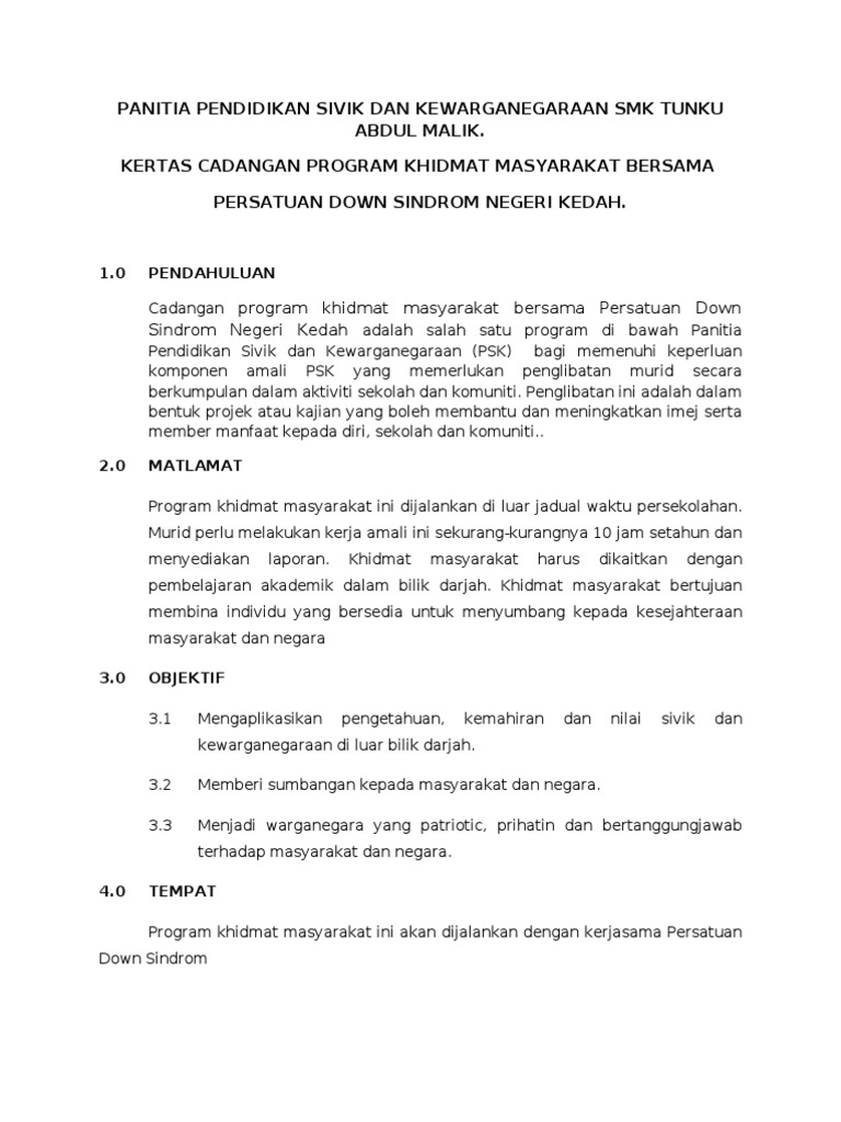 KERTAS KERJA CADANGAN BAGI PROGRAM KHIDMAT MASYARAKAT DI RUMAH ANAK-ANAK YATIM NURUL IHSAN SG SIPUT 10 TUJUAN Kertas kerja ini bertujuan untuk mendapatkan kelulusan Seminar dan Projek Pelajar untuk menganjurkan Program Loving is Caring bagi memenuhi syarat kerja. Kertas kerja program khidmat masyarakat taburkan jasa dan semaikan budi gotong-royong membersihkan kawasan surau bukit puteri hp kemahiran pengurusan maklumat dan pembelajaran sepanjang hayat universiti kebangsaan malaysia 10. Khidmat Masyarakat ialah komponen amali Pendidikan Sivik dan Kewarganegaraan yang memerlukan penglibatan murid secara kumpulan dalam aktiviti sekolah dan komuniti.